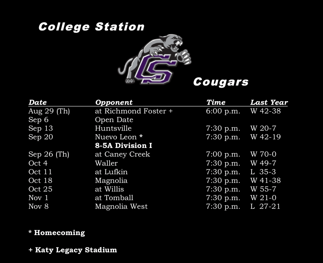 | College Station | 5 | 2 | 8 | 4 | 451 | 309 |