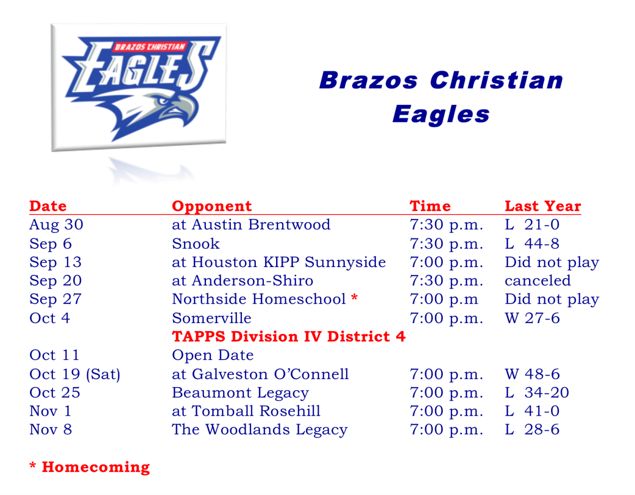 | Brazos Christian | 3 | 1 | 8 | 4 | 458 | 263 |