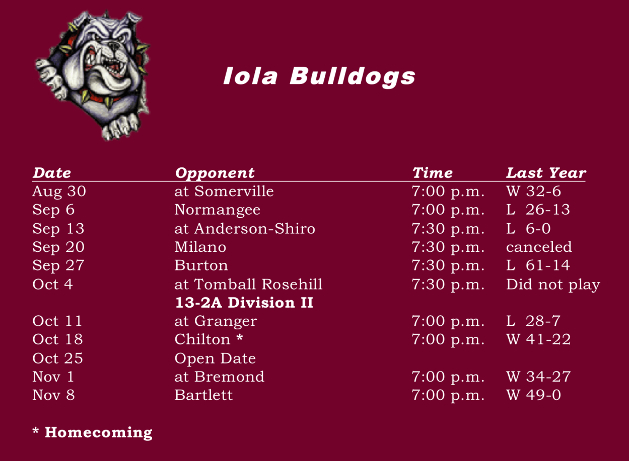 | Bremond | 4 | 0 | 12 | 2 | 592 | 322 |