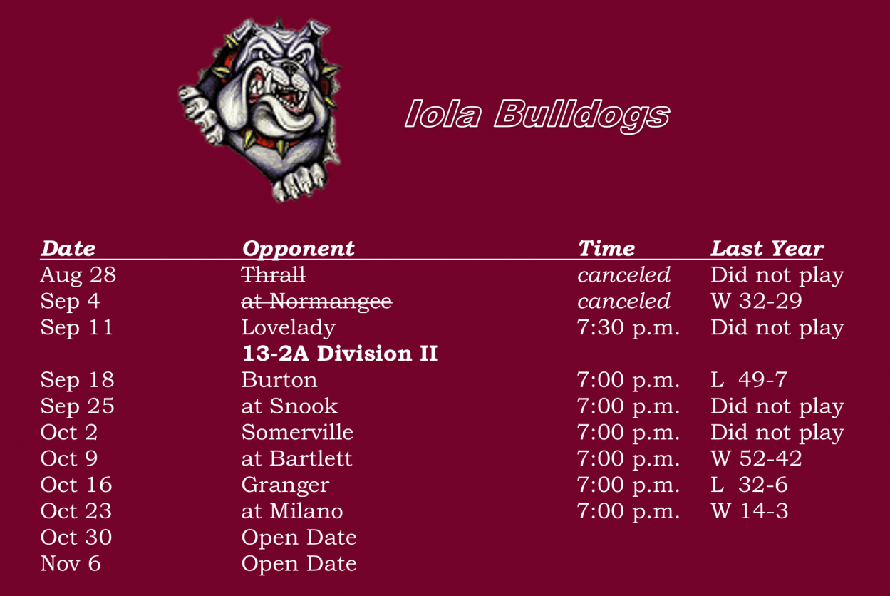 | Iola | 4 | 2 | 4 | 4 | 246 | 238 |
