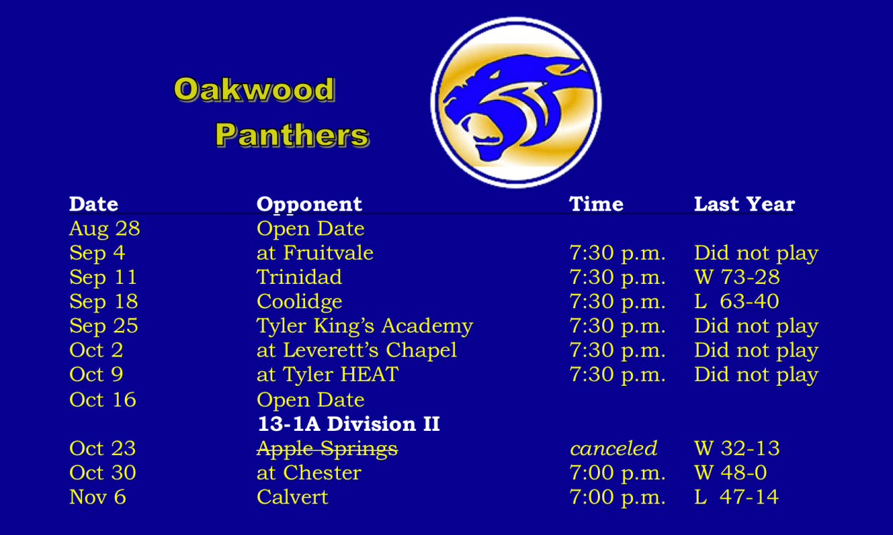 | Oakwood | 1 | 1 | 5 | 4 | 382 | 340 |