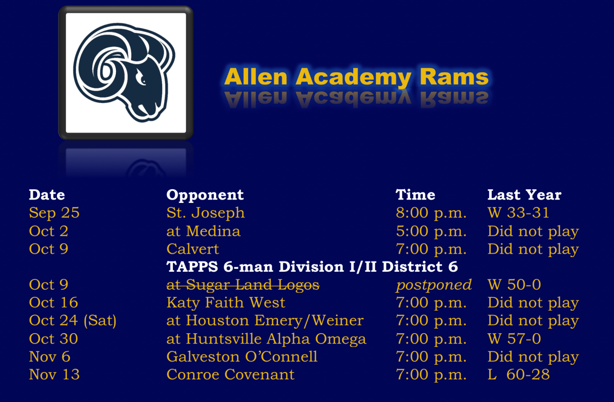 | Allen Academy | 3 | 1 | 7 | 4 | 587 | 296 |